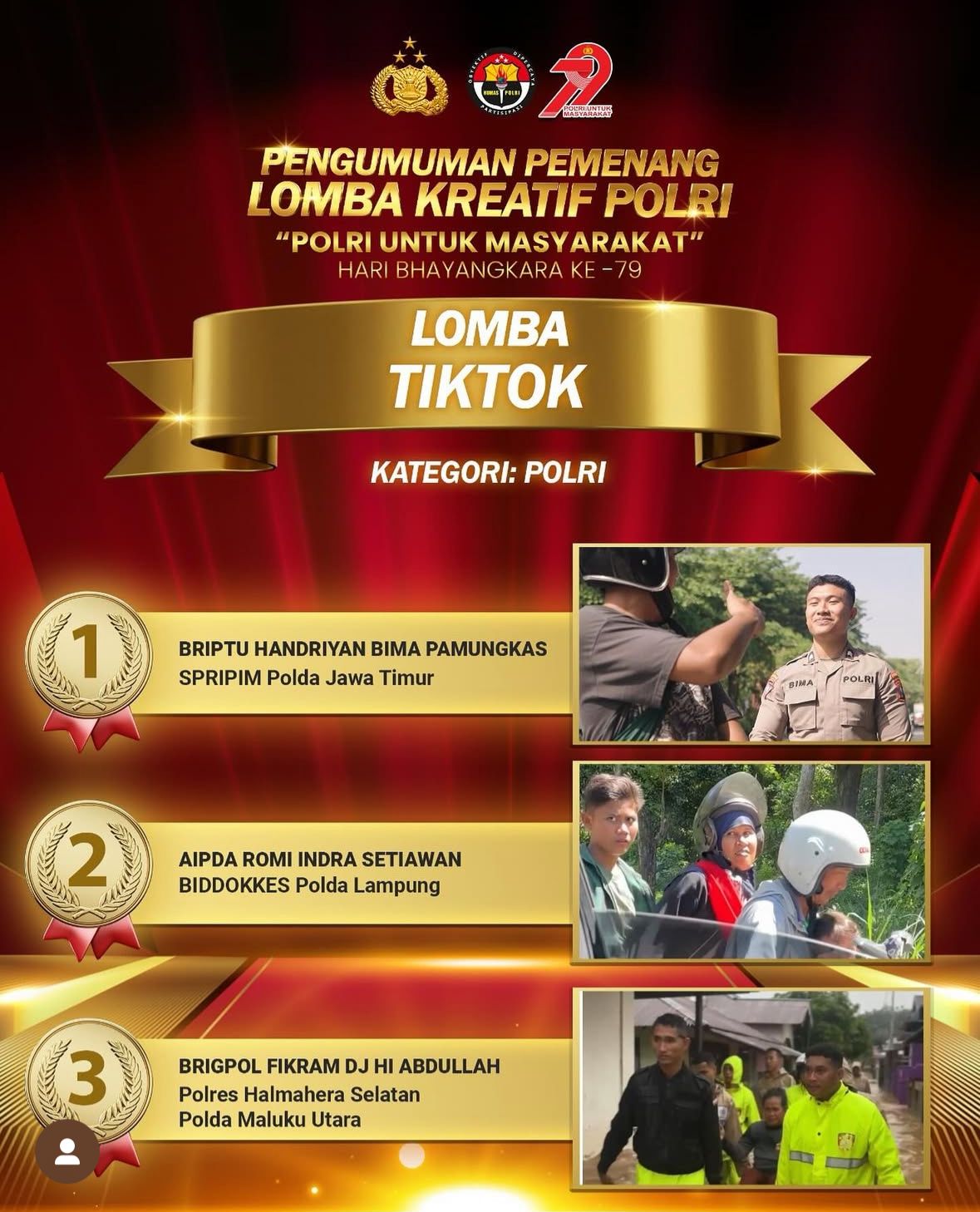LAMPUNG – Aipda Romi Indra dari Satker Biddokes Polda Lampung berhasil meraih Juara 2 Lomba Konten Kreator TikTok Kategori POLRI yang diselenggarakan oleh Divisi Humas Polri dalam rangka Hari Bhayangkara ke-79 pada Selasa, 08-Juli-2025.