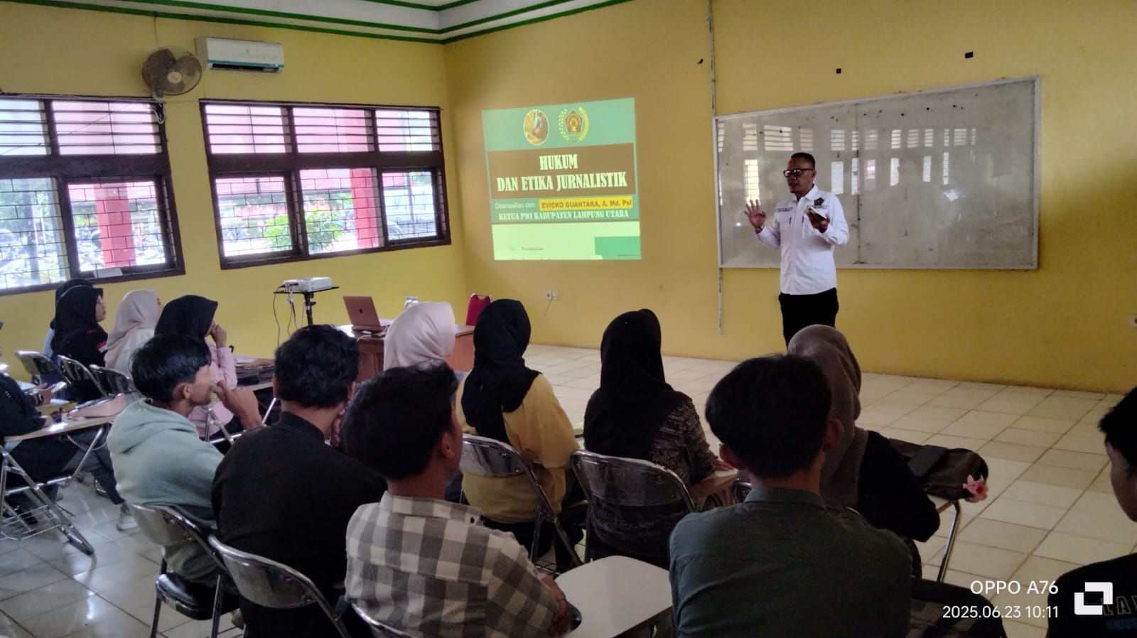 LAMPUNG UTARA, – Ketua Persatuan Wartawan (PWI) Kabupaten Lampung Utara (Lampura) Evicko Guantara menjadi Narasumber tentang Hukum dan Etika Jurnalistik dalam Prodi jurusan Hukum di Universitas Muhammadiyah Kotabumi (Umko) pada Senin, 23 Juni 2025.