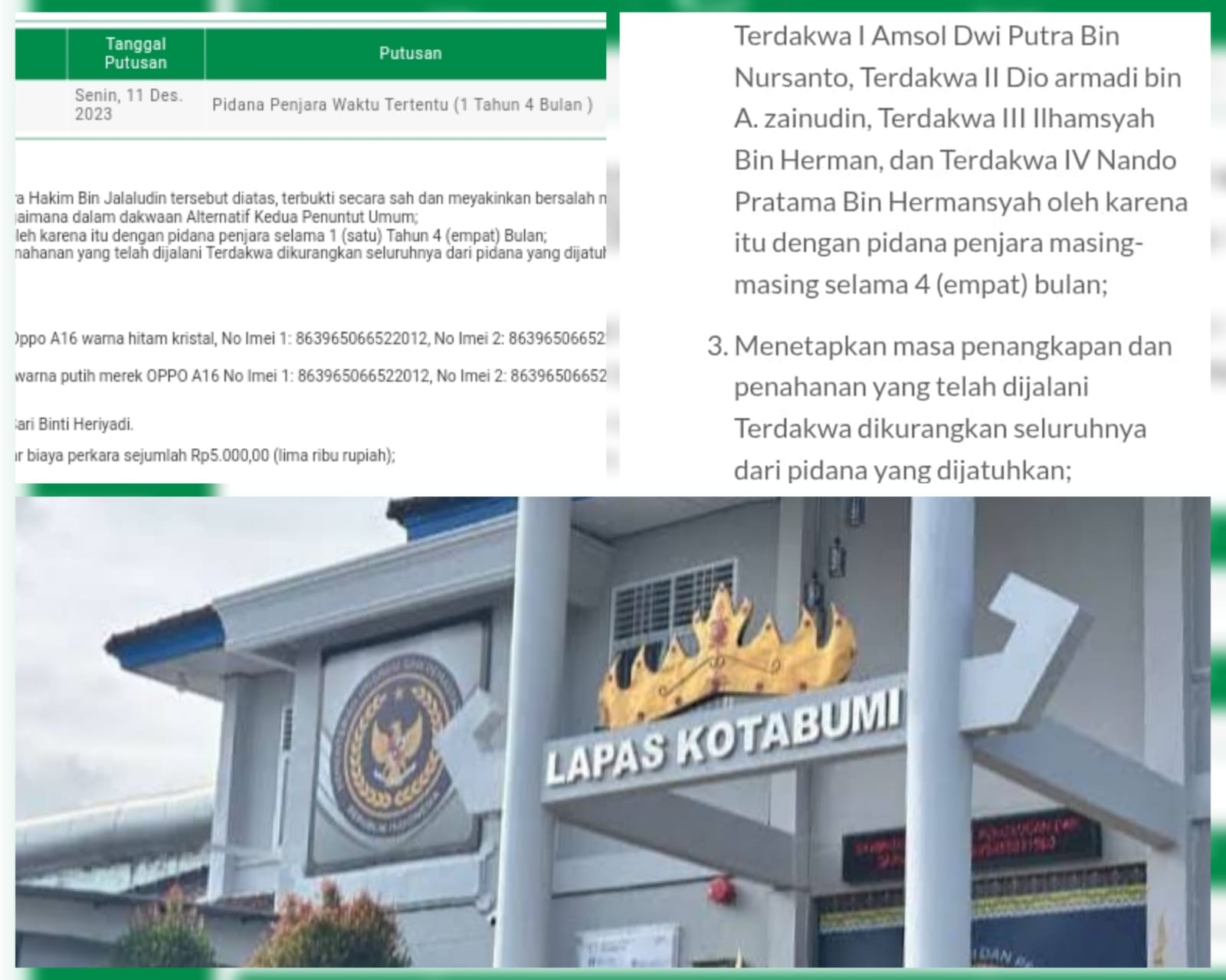 Ungkapan itu, terbantahkan dengan data putusan yang dikeluarkan Pengadilan Negeri Lampung Utara. Dimana putusan Pengadilan Negeri Kotabumi tertanggal 11 September 2024 dengan nomor 180/PID.B/2024/PN, menyebutkan Nando Pratama bersama tiga rekannya ditetapkan bersalah oleh Pengadilan Negeri Kotabumi dan diingkrahkan empat bulan penjara dalam kasus pencurian. Bukan Narkoba.