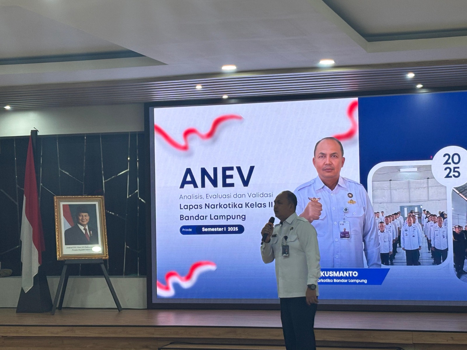 BANDAR LAMPUNG – Kepala Lembaga Pemasyarakatan (Lapas) Narkotika Kelas IIA Bandar Lampung, Ade Kusmanto, memaparkan hasil capaian kinerja sepanjang Semester I Tahun 2025 dalam kegiatan Analisis, Evaluasi, dan Validasi (ANEV) yang digelar oleh Kantor Wilayah Direktorat Jenderal Pemasyarakatan (Ditjenpas) Lampung. Kamis (31/07)