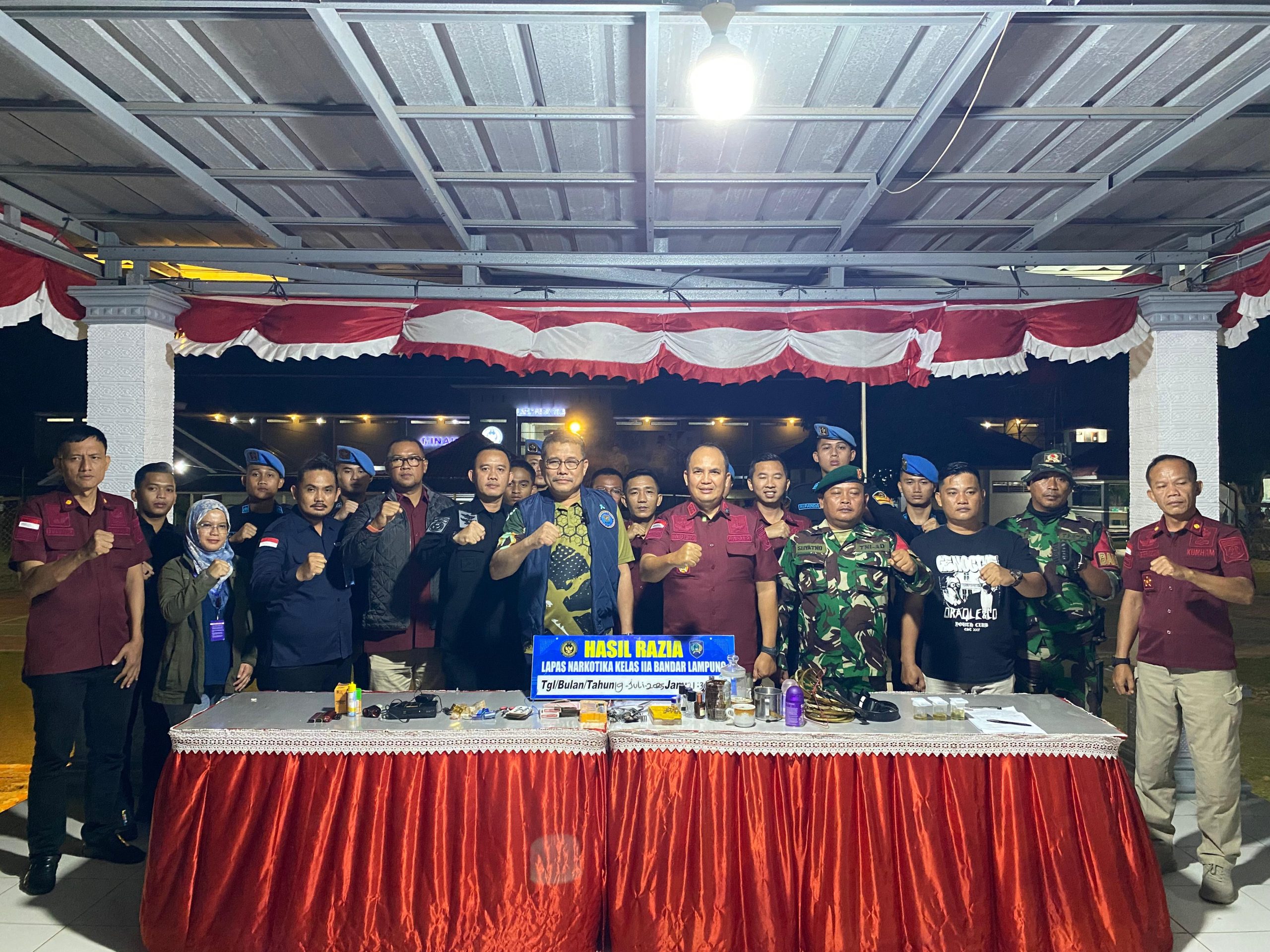 “Malam ini kami menggelar razia yang disaksikan langsung oleh Kepala BNN Provinsi Lampung dalam rangka Pencegahan, Pemberantasan, Penyalahgunaan, dan Peredaran Gelap Narkotika serta deteksi dini potensi gangguan keamanan dan ketertiban,” ujar Kalapas Narkotika Kelas IIA Bandar Lampung, Ade Kusmanto.