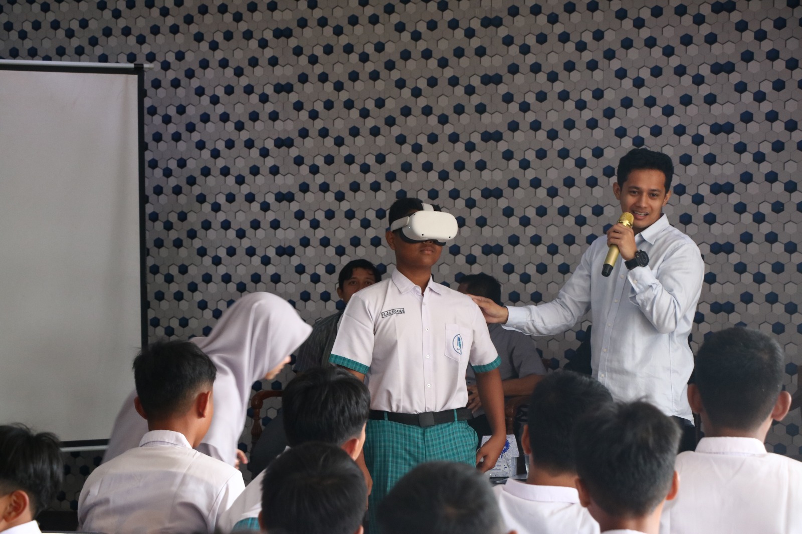 Antusias pelajar SMP IT Auladina Indonesia QIIBS asyik menggunakan kacamata tersebut dengan panduan dari dosen Prodi Teknik Informatika Muhammad Fauzan Azima, S.Kom., M.T.I. dan Triowali Rosandy, S.Kom., M.T.I. Usai mencoba kacamata VR puluhan pelajar menuju studio DKV yang berada di lantai dasar Gedung F.