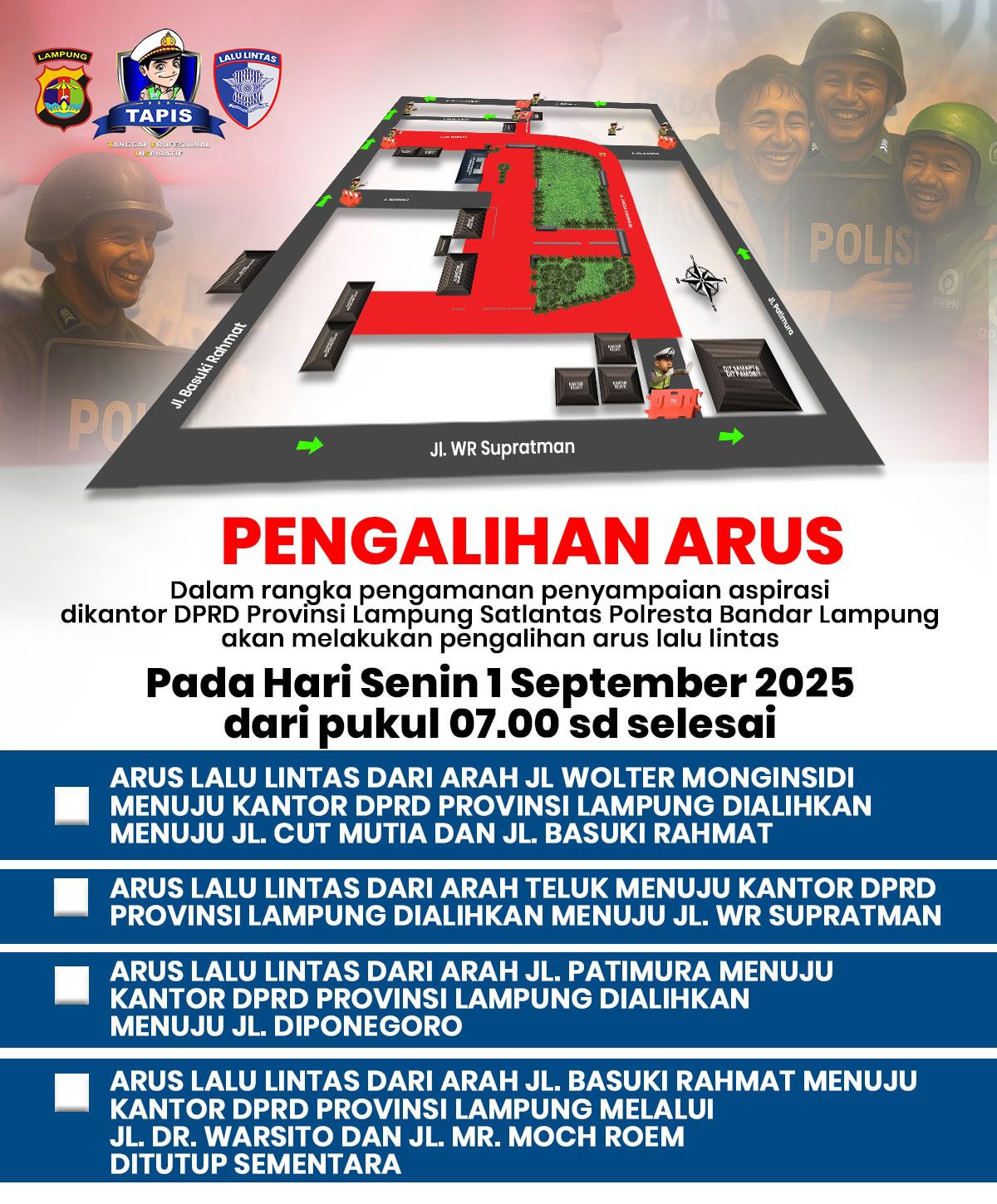 LAMPUNG – Satuan Lalu Lintas (Satlantas) Polresta Bandar Lampung akan memberlakukan pengalihan arus lalu lintas pada Senin, 01-September-2025 mulai pukul 07.00 WIB hingga selesai. Langkah ini dilakukan untuk mendukung kelancaran dan keamanan penyampaian aspirasi di Kantor DPRD Provinsi Lampung.